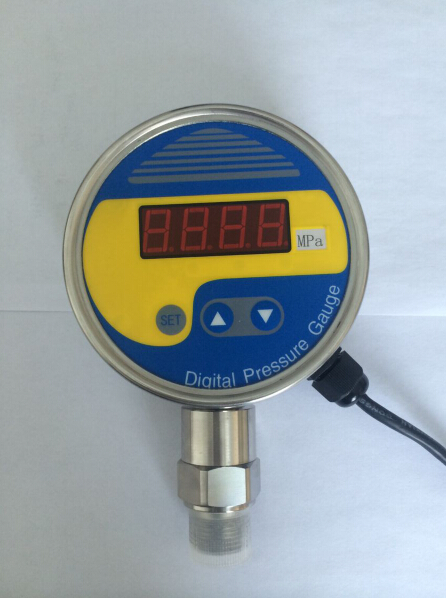 數字遠傳壓力表為全電子結構,前端采用帶隔離膜充油壓阻式壓力傳感器,輸出信號由高準確度,低溫漂的放大器放大處理,送入高準確度的A/D轉換器,轉換成微處理器可以處理的數字信號,經過運算處理,由LED顯示器顯示出實際的壓力值。