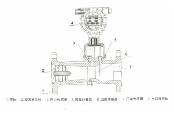 1、旋渦發生體 2、殼體 3、智能流量計積算儀 4、溫度傳感器 5、壓力傳感器 6、壓電晶體傳感器 7、消旋器