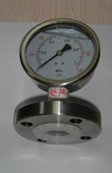 當測量介質(zhì)的壓力P作用于隔膜時,隔膜產(chǎn)生變形,壓縮壓力表測壓系統(tǒng)的密封液,使其形成P-P的壓力,當隔膜的剛性足夠小時,則P也很小,隔膜壓力表的測壓系統(tǒng)形成的壓力就等于測量介質(zhì)的壓力。