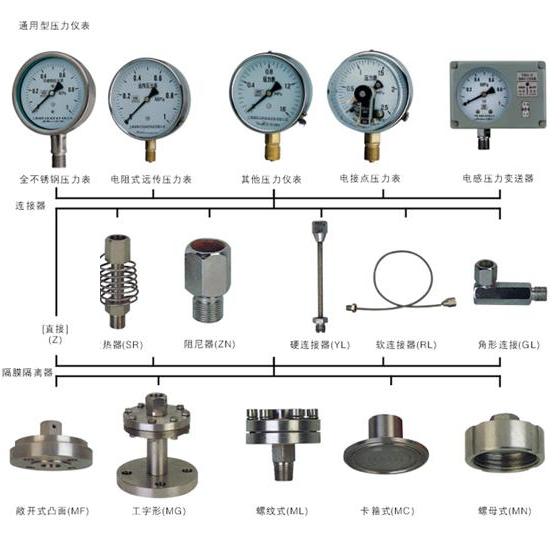 通用儀表為Y-100B表盤,膜片材料為316不銹鋼,測量范圍如0~1MPA,國標螺紋M20*1.5,法蘭DN25等 連接形式為直接。或采用工字型法蘭,卡箍衛生型等.