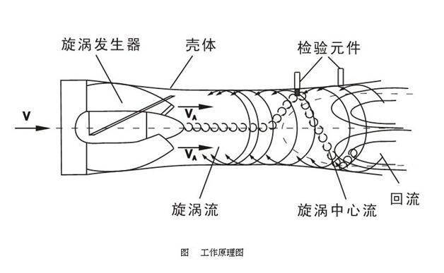 旋進(jìn)旋渦流量計的流量傳感器的流通剖面類似于文丘里管的型線。在入口側(cè)安放一組螺旋形導(dǎo)流葉片,當(dāng)流體進(jìn)入流量傳感器時,導(dǎo)流葉片迫使流體產(chǎn)生劇烈的旋渦流。當(dāng)流體進(jìn)入到擴(kuò)散段時,旋渦流受回流的作用開始作二次旋轉(zhuǎn),形成陀螺式的渦流進(jìn)動現(xiàn)象,該進(jìn)動頻率與流量大小成正比,不受流體物理性質(zhì)和密度的影響,檢測元件測得流體二次旋轉(zhuǎn)進(jìn)動頻率就能在較寬的流量范圍內(nèi)獲得較好的線性度。信號經(jīng)前置放大器放大、濾波、整形轉(zhuǎn)換為與流速成正比的脈沖信號,然后再與溫度、壓力等檢測信號一起被送往微處理器進(jìn)行積算處理,后在液晶顯示屏上顯示測量結(jié)果(瞬時流量、累積流量及溫度、壓力等數(shù)據(jù))。  當(dāng)流體通過由螺旋形葉片組成的旋渦發(fā)生器,流體被迫繞著發(fā)生體軸劇烈旋轉(zhuǎn),形成旋渦。當(dāng)流體進(jìn)入擴(kuò)散段時,旋渦流受到回流的作用,開始作二次旋轉(zhuǎn),形成陀螺式的渦流進(jìn)動現(xiàn)象。該進(jìn)動頻率與流量大小成正比,不受流體物理性質(zhì)和密度的影響。檢測元件測得流體二次旋轉(zhuǎn)進(jìn)動頻率,就知道了流量。而且能在較寬的流量范圍內(nèi)獲得良好的線性度。