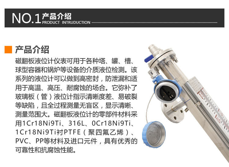 磁翻板液位計儀表可用于各種塔、罐、槽、球型容器和鍋爐等設備的介質液位檢測。該系列的液位計可以做到高密封,防泄漏和適用于高溫、高壓、耐腐蝕的場合。它彌補了玻璃板(管)液位計指示清晰度差、易破裂等缺陷,且全過程測量無盲區,顯示清晰、測量范圍大。磁翻板液位計的零部件材料采用1Cr18Ni9Ti、316L、OCr18Ni9Ti、1Cr18Ni9Ti襯PTFE(聚四氟乙烯)、PVC、PP等材料及進口元件,具有可靠性和抗腐蝕性 。