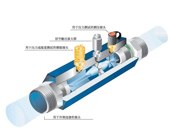 渦輪的轉(zhuǎn)速通過裝在機(jī)殼外的傳感線圈來檢測。當(dāng)渦輪葉片切割由殼體內(nèi)較久磁鋼產(chǎn)生的磁力線時(shí),就會(huì)引起傳感線圈中的磁通變化。傳感線圈將檢測到的磁通周期變化信號(hào)送入前置放大器,對(duì)信號(hào)進(jìn)行放大、整形,產(chǎn)生與流速成正比的脈沖信號(hào),送入單位換算與流量積算電路得到并顯示累積流量值;同時(shí)亦將脈沖信號(hào)送入頻率電流轉(zhuǎn)換電路,將脈沖信號(hào)轉(zhuǎn)換成模擬電流量,進(jìn)而指示瞬時(shí)流量值。